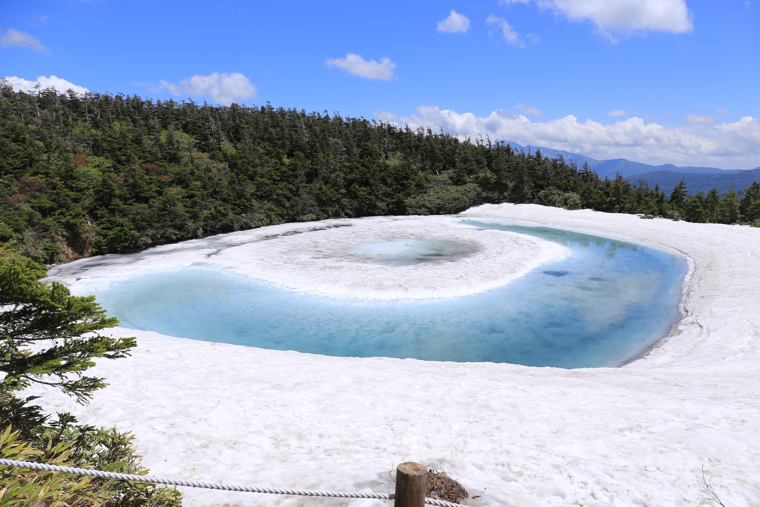 奥羽山脈を形成する岩手山・ハ幡平・安比高原は、岩手県と秋田県の県境に連なる成層火山、鐘状火山、楯状火山の織りなす連峰です。国の特別天然記念物焼走り熔岩流、岩手山のコマクサ、シラネアオイ群落を始め、火口内にさらに小火山体ができた複式火山の景観を望む鬼ヶ城から黒倉山、姥倉山、犬倉山、大松倉山、三ツ石山、小畚山、大深岳、源太ケ岳、嶮岨森、諸桧岳、畚岳と連なる裏岩手連峰、日本百名山の八幡平、源太森、茶臼岳、オオシラビソからブナ林へと変化する安比高原、安比ブナ二次林へと続く総延長50kmの雲上のトレイルコースです。遠くには、鳥海山、八甲田山、岩木山、森吉山、早池峰山などの名山が望めます。